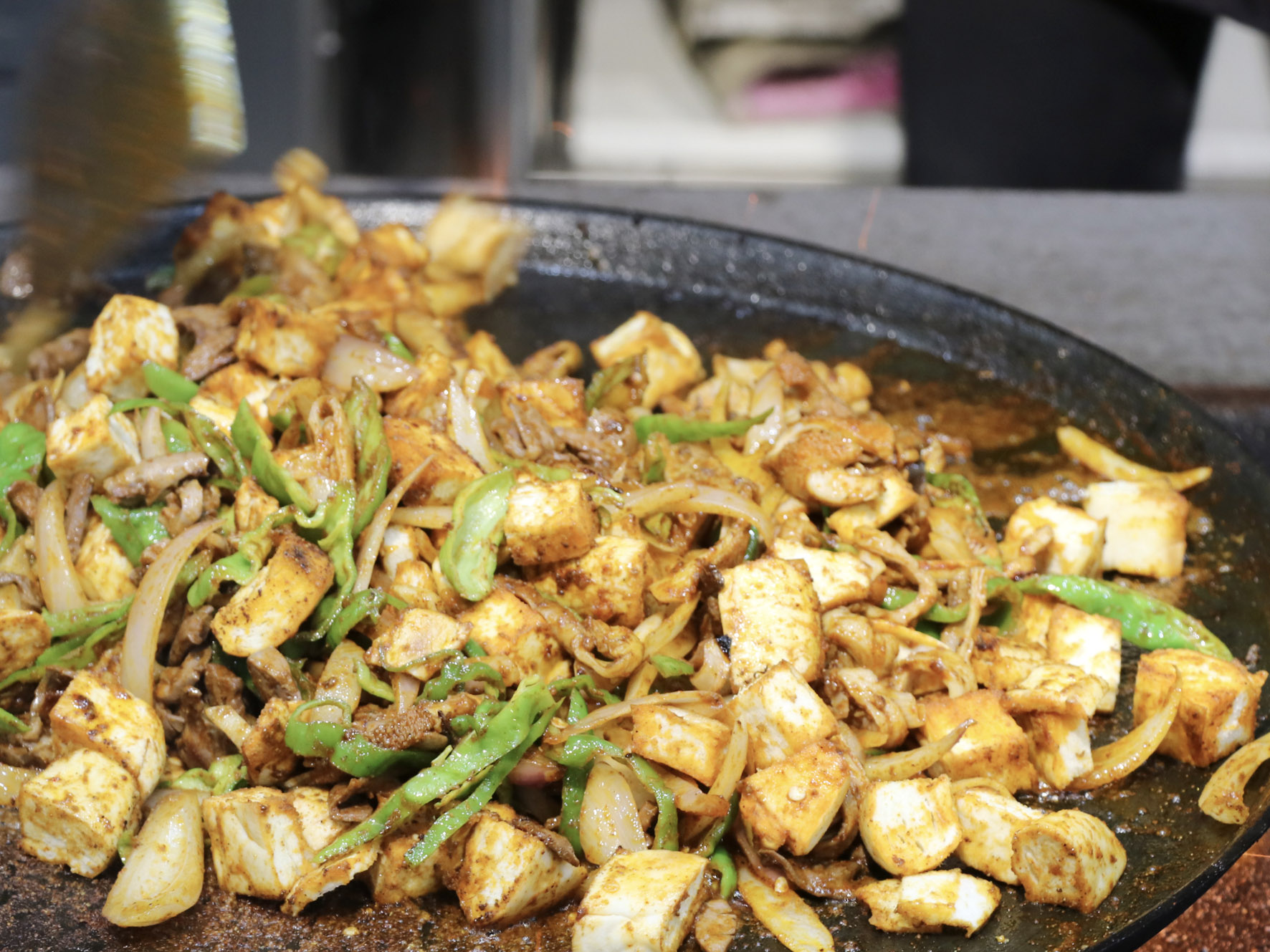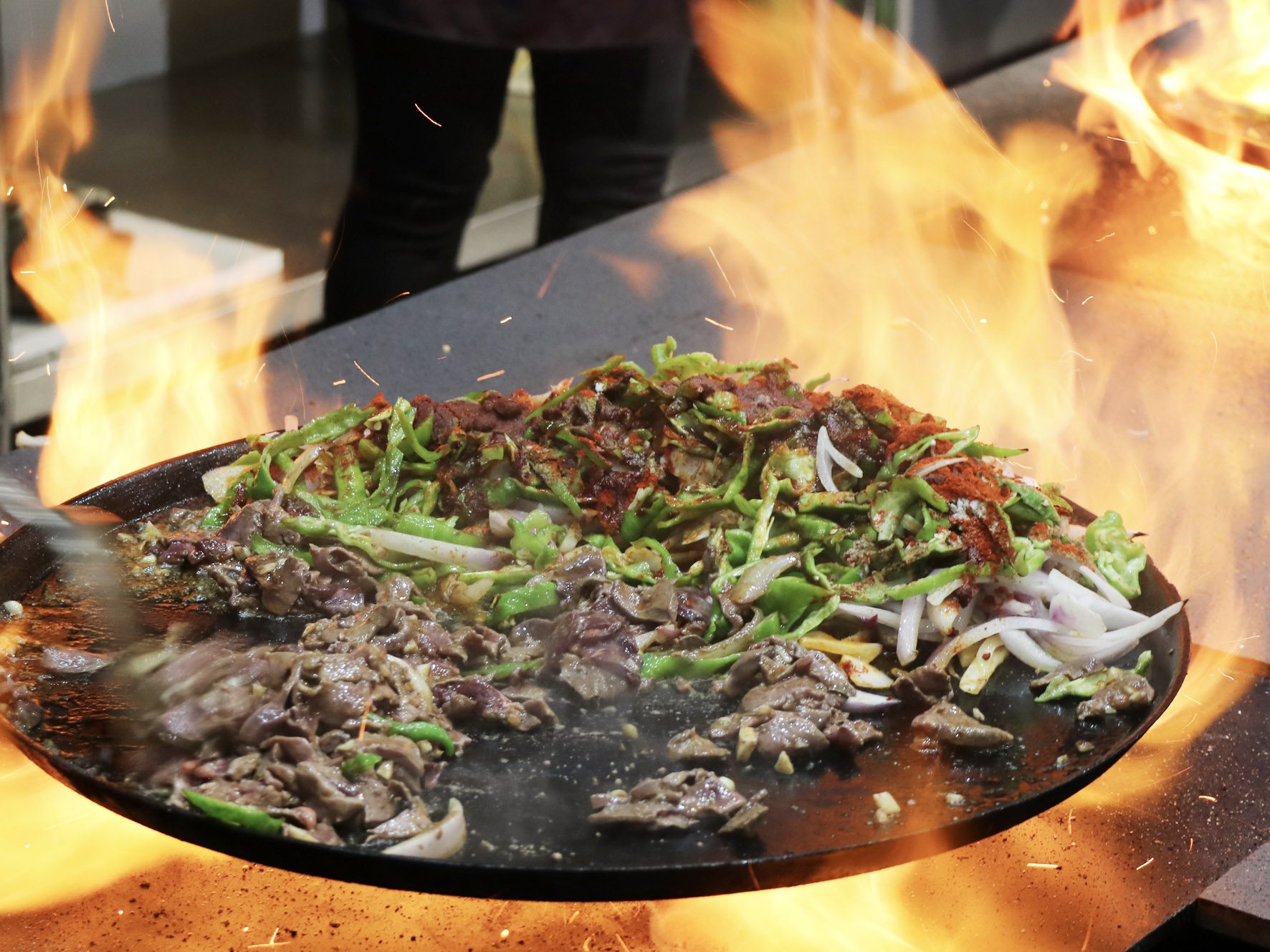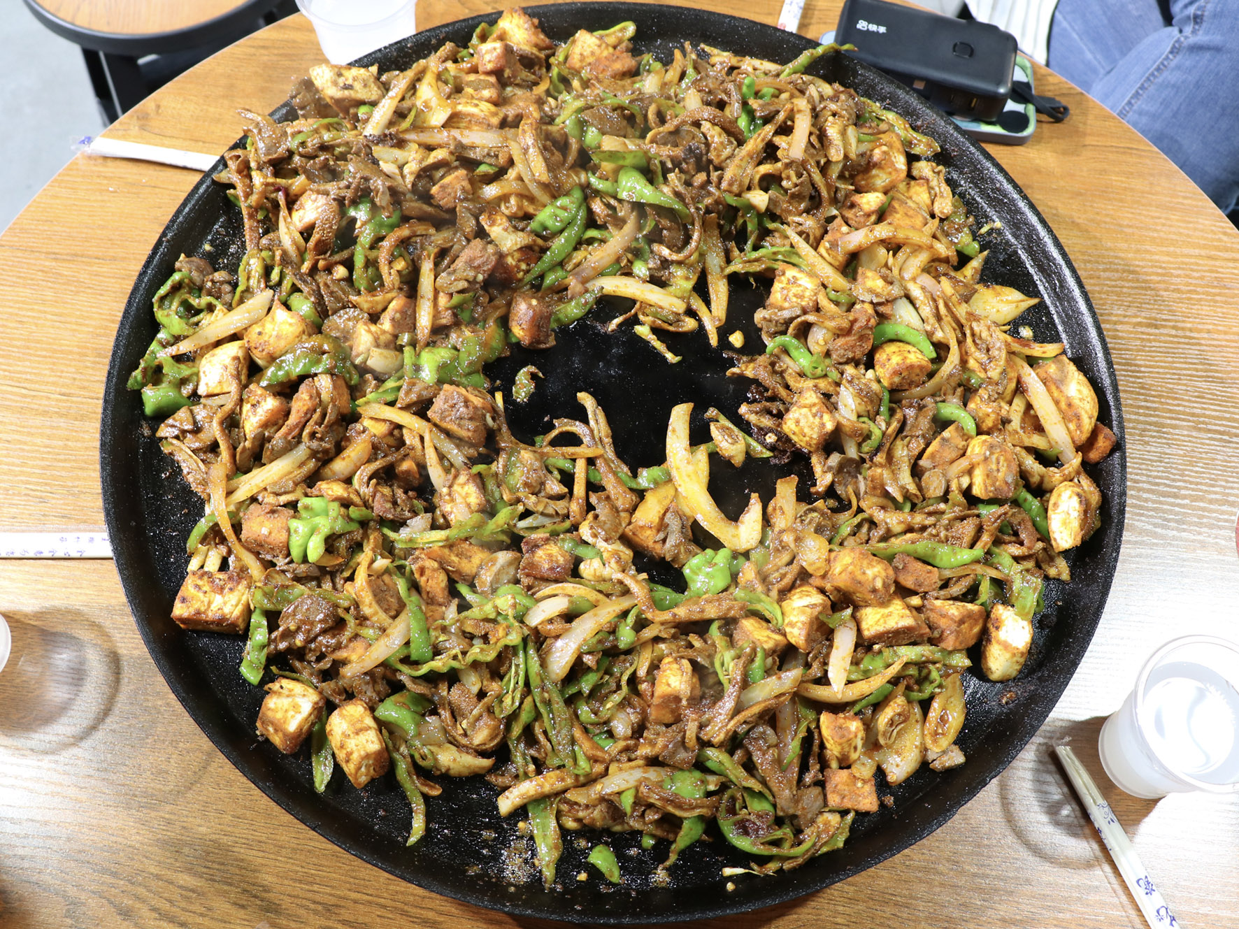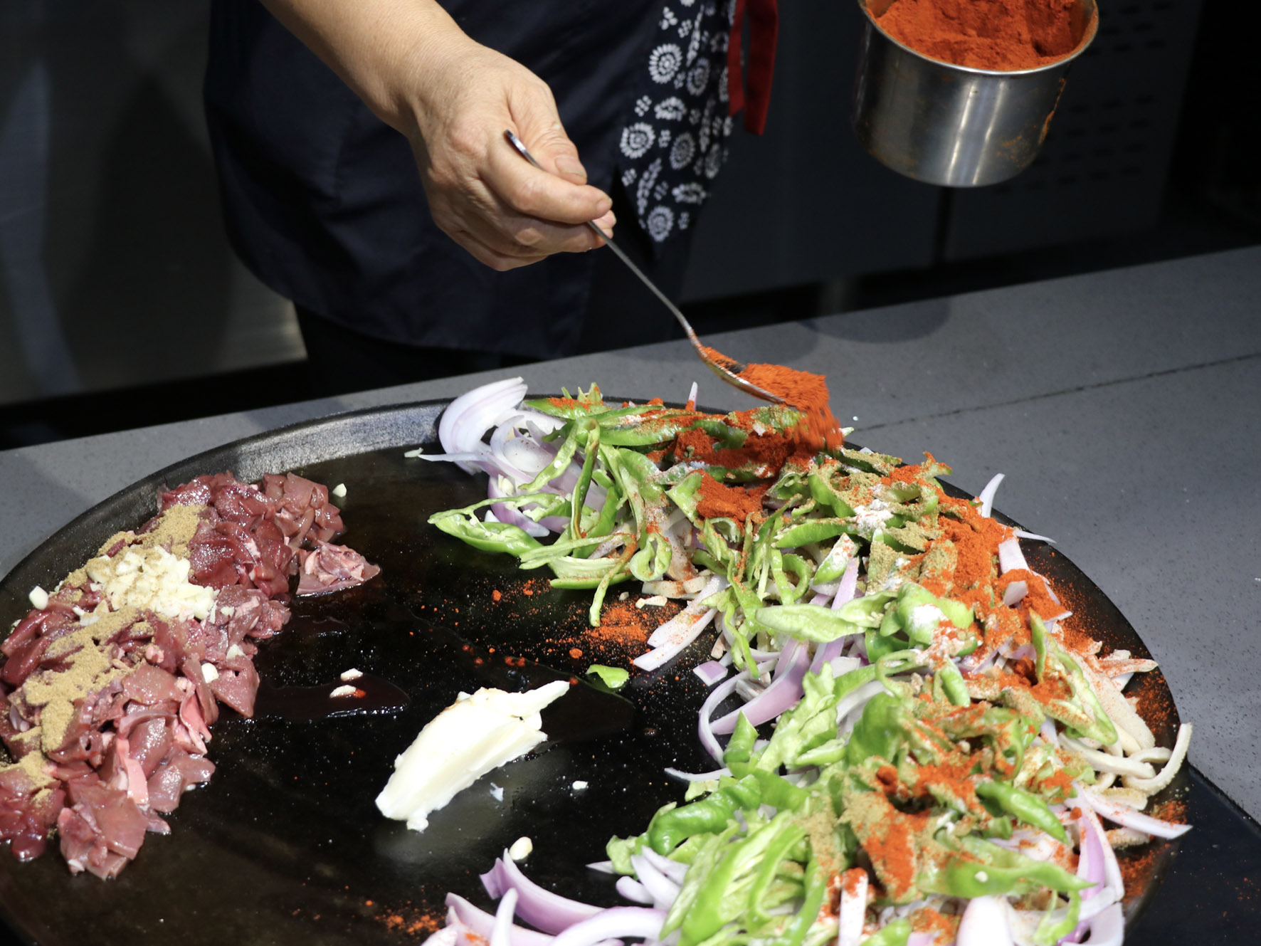 最美味的食物往往來(lái)自于最樸素的食材,只見(jiàn)店家將切好的羊肝、肺、肚、腸、心等佐以洋蔥、青椒下入一個(gè)鑄鐵鏊子里,再加上幾勺鹽和辣椒面,開(kāi)始用猛火爆炒,火星四濺,一頓撥拉之后,待到七分熟左右再放入提前準(zhǔn)備好的白餅塊一起翻炒即可。