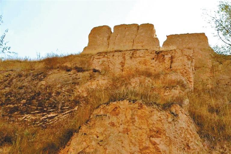 在威戎鎮(zhèn)見(jiàn)到的第一處遺存,是位于威戎鎮(zhèn)廣場(chǎng)后的一處臺(tái)地。這一處遺存,是一段殘破的老城墻,以及一座形似堡樓的殘?jiān)?。站在臺(tái)地之下,仰望斷墻,人工修筑的痕跡十分明顯,層層黃土夯筑,因?yàn)閺U棄殘破而長(zhǎng)滿了荒草。走近堡樓,可以看見(jiàn)當(dāng)時(shí)修筑時(shí)搭建木椽的孔洞,還有很多手掌大小的圓形石塊。