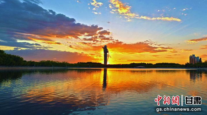 嘉峪關地標性建筑氣象塔迎來日出。毛富 攝