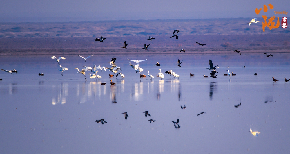 秋風輕柔,成群結(jié)隊的候鳥在水面上自游穿梭、追逐嬉戲,與藍天、湖水、蘆葦、胡楊、沙漠構(gòu)成了一幅美麗和諧的生態(tài)畫卷,盡顯一片生機勃勃。