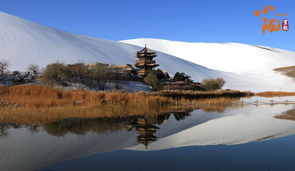 敦煌下雪之后,一半沙漠一半雪。冬日暖陽下,月牙泉像一面鏡子,將沙漠映照得更為浪漫,讓人產(chǎn)生無限遐想。