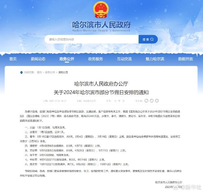 1月5日對哈爾濱人來說是一個(gè)特別的假期。據(jù)《哈爾濱市人民政府辦公廳關(guān)于2024年哈爾濱市部分節(jié)假日安排的通知》,冰雪節(jié)2024年1月5日(星期五)公休1天。明天,第40屆中國·哈爾濱國際冰雪節(jié)將盛大啟幕。