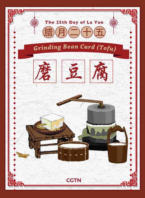 傳說玉皇大帝會(huì)在臘月二十五下凡巡視人間,看家家戶戶是否都過著誠實(shí)勤儉的生活。為了表現(xiàn)得節(jié)儉以獲得玉皇大帝降福,傳統(tǒng)上人們會(huì)磨豆腐來吃,豆腐在中國是一種便宜的食品。