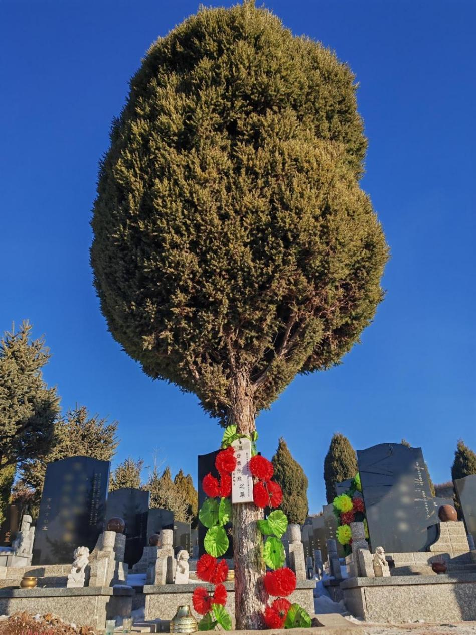 遼寧阜新市公墓的東南角,一棵挺拔翠綠的柏樹樹干上,掛有一個(gè)長(zhǎng)30厘米、寬10厘米的小木牌,上寫有“魏彤欣之墓”,一束花環(huán)環(huán)繞周圍,在陽(yáng)光的照耀下格外絢麗。