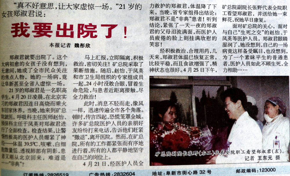 作為部門領(lǐng)導(dǎo),她依然表現(xiàn)出色,2003年“非典”期間,她擔(dān)任阜新晚報(bào)要聞部主任,她提出“最危險(xiǎn)的地方,我先上!”4月20日,有一個(gè)學(xué)生從北京回來(lái),因?yàn)楦邿煌吮粦岩蔀楦腥?ldquo;非典”,一時(shí)間謠言四起,恐慌籠罩全城,魏彤欣一個(gè)人冒著風(fēng)險(xiǎn)深入醫(yī)院跟蹤采訪,在得知確診不是“非典”后,第一時(shí)間發(fā)出了報(bào)道《我要出院了》,及時(shí)消除了公眾恐慌情緒。她帶領(lǐng)記者深入發(fā)熱門診、城市出入口的檢查站和醫(yī)護(hù)人員之間,掌握了大量的一手材料,共采寫了70余篇稿件,她本人被評(píng)為“遼寧省抗擊非典新聞宣傳先進(jìn)個(gè)人”,她所在的部門被評(píng)為“遼寧省抗擊非典新聞宣傳先進(jìn)集體”。