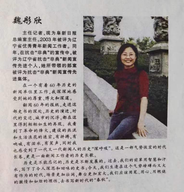 魏彤欣1993年進(jìn)入阜新日?qǐng)?bào)社做記者,她給自己定的努力方向就是:到一線去,到平凡的生活中去,歌頌美好情操,弘揚(yáng)時(shí)代精神。她撰寫的20余篇新聞作品榮獲省級(jí)以上新聞獎(jiǎng)項(xiàng),她本人榮獲阜新市十大女杰、遼寧省十佳新聞工作者等多項(xiàng)榮譽(yù)。