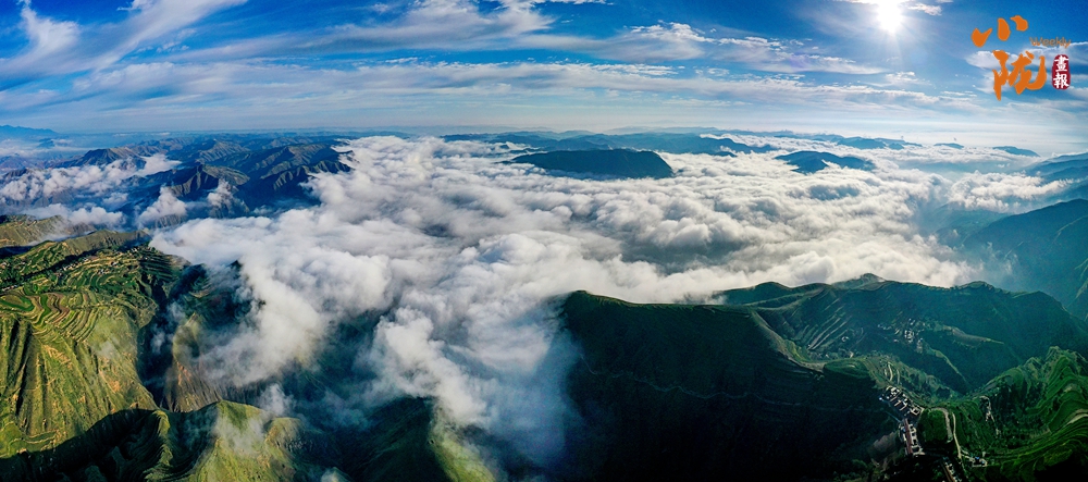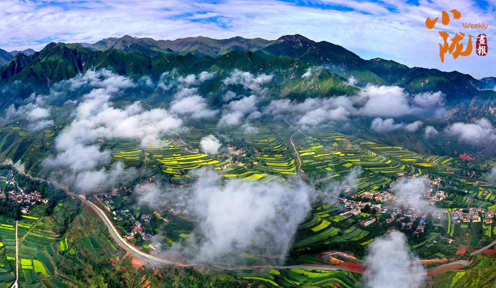 在旅游大通道積石山段遠(yuǎn)眺,云霧穿山飄過,遠(yuǎn)處的村莊和梯田時隱時現(xiàn),遠(yuǎn)山近嶺,草樹煙村......置身其中,仿佛步入了人間仙境。