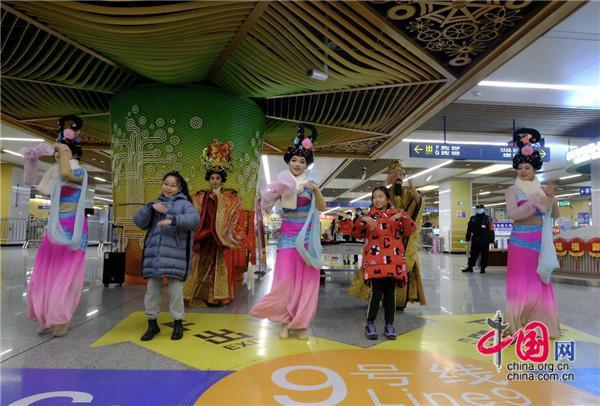 2020年底,西安地鐵9號(hào)線開通之際,華清池站帝妃攜仕女表演的《霓裳羽衣舞》,秦王攜眾臣高呼“我們有地鐵了”的聲音依舊回旋耳邊。時(shí)值龍年新春佳節(jié),廣大乘客在乘坐安全舒適西安地鐵9號(hào)線的同時(shí),將再次有機(jī)會(huì)在地鐵車站和地鐵列車上來一場(chǎng)“秦唐”文化的穿越之旅。