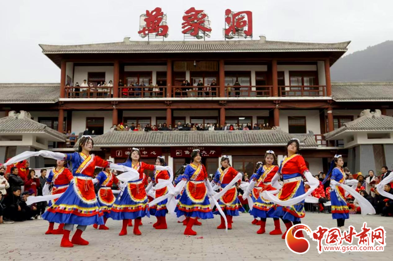 2024年2月21日,在甘肅省隴南市國家AAAA級景區(qū)——武都區(qū)萬象洞風(fēng)景名勝區(qū),當(dāng)?shù)厝罕娊M織的社火表演隊(duì)正在演出。