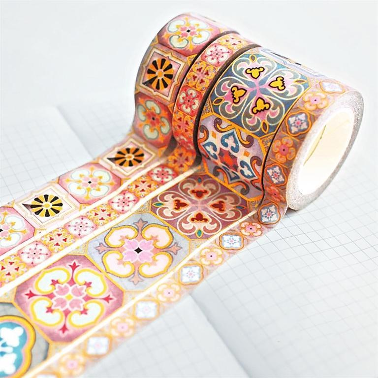 紋樣膠帶——在眾多文創(chuàng)產(chǎn)品中,膠帶的銷售或人氣排行榜靠前。紙膠帶雖是個小物件,但藝術(shù)化的紙膠帶卻能夠滿足多種需求,適應(yīng)多層次人群的需求。圖形多來自器物上的印刻、繪制圖案,或抽象或具體。這也就體現(xiàn)了兩種效果,一種是文藝范,另一種是趣味感,來自重構(gòu)傳統(tǒng)的高大上,消解歷史的審美觀。設(shè)計(jì)靈感來自中國傳統(tǒng)紋樣,融合敦煌元素,有層次的色彩斑斕,圖案以及細(xì)節(jié)都恰到好處。