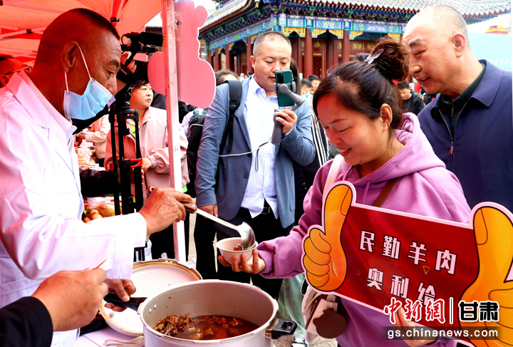 3月下旬,民勤縣在天水啟漢樓廣場舉行推介會(huì),宣傳本地旅游資源和農(nóng)特優(yōu)產(chǎn)品。圖為游客一邊品嘗民勤羊肉,一邊聆聽美食背后的文化和故事。 周旦 攝