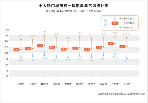 熱門城市中,北京5月1日至4日以晴為主,最高氣溫在26℃至28℃,適宜出行游玩,5日預(yù)計將出現(xiàn)小雨,氣溫略有下降。西安則在4日會出現(xiàn)小雨,其他時間以多云和陰天為主,氣溫在23℃上下,非常適宜出行。位于中東部地區(qū)的上海、杭州、南京等熱門城市5月1日-3日均以多云和陰天為主,最高氣溫均在20℃左右,溫度適宜,4至5日將出現(xiàn)小雨,出行還需注意做好防雨準備。長沙和武漢3日至4日將出現(xiàn)中雨至大雨天氣,不適宜戶外游玩。位于西南地區(qū)的成都和重慶“五一”假期前四天都將被小雨籠罩,直到5日才會放晴。
