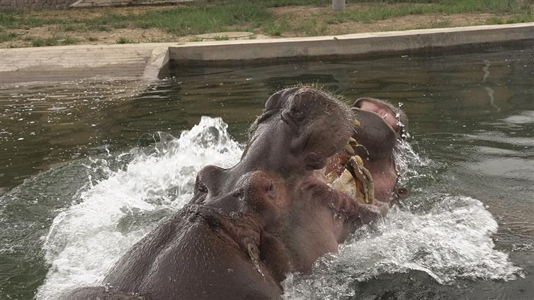 “小乖”今年正值青春活潑的年紀,性格溫順可愛。經(jīng)過一段時間的精心準備與適應期,“小乖”已經(jīng)與老住戶“大嘴”和諧相處,一同在水中暢游、嬉戲玩耍,或是在岸邊悠閑進食、曬著太陽。兩只河馬的互動與陪伴,給園區(qū)增加了許多樂趣,也給游客們帶來更加新奇、歡樂的觀賞體驗。