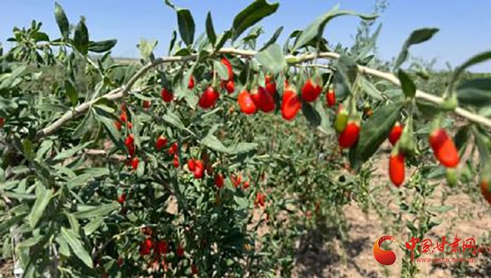 一排排生機(jī)勃勃的枸杞樹在祁林中地里恣意生長著,嬌艷似火的枸杞掛滿枝條,散發(fā)出誘人的香味,與藍(lán)天、白云、雪山、綠水、黃色的草帽相映生輝,折射出一幅沁人心扉的畫卷。