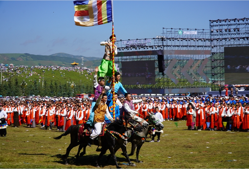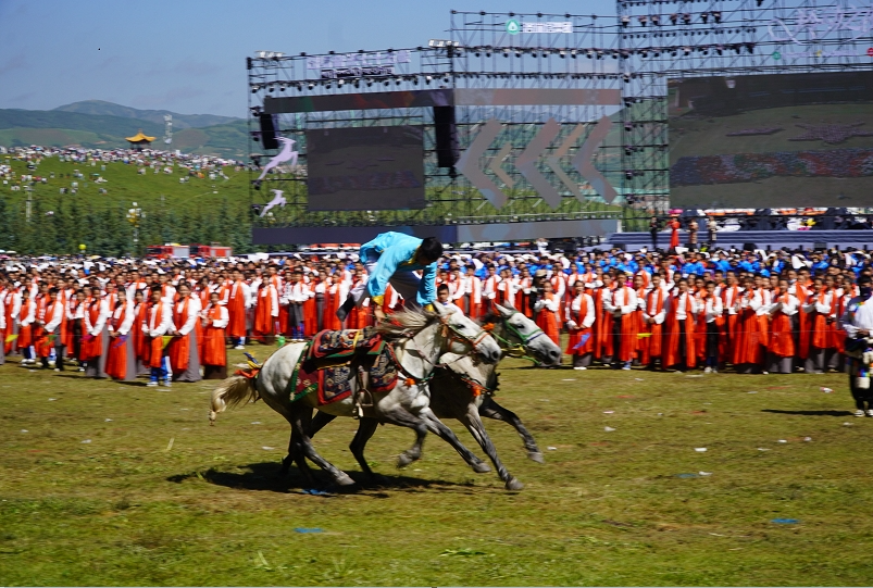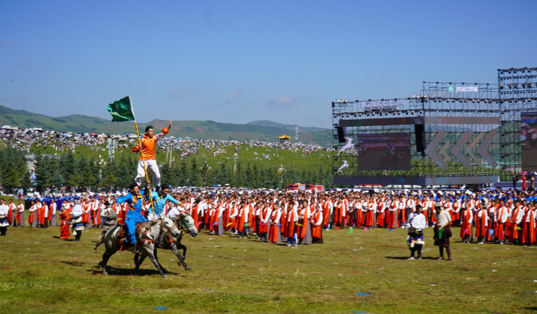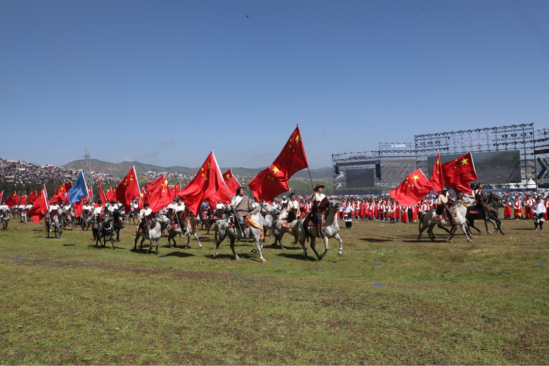 草原騎手乘著矯健的駿馬高舉著鮮艷的五星紅旗從主席臺(tái)前奔馳而過,讓在場(chǎng)的數(shù)萬觀眾贊嘆不已,呈現(xiàn)出一個(gè)絢麗多彩的甘南、和諧穩(wěn)定的甘南、朝氣蓬勃的甘南、包容開放的甘南、團(tuán)結(jié)奮進(jìn)的甘南。