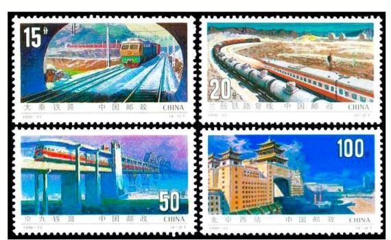 1996年9月,我國發(fā)行編號為1996-22的《鐵路建設》郵票一套四枚,其中T4-2圖為蘭新鐵路復線。票面上,一貨一客兩列火車蜿蜒在蘭新鐵路復線,氣勢如虹。而嘉峪關關城作為一個地理標志,被處理成蘭新鐵路復線的背景圖案,放在郵票主圖的后方。盡管由于票面所限,背景圖案上的嘉峪關關城畫面很小,無以淋漓盡致地表現(xiàn)嘉峪關城樓的細節(jié),但其“天下第一雄關”的雄姿絲毫不減。而嘉峪關出現(xiàn)在表現(xiàn)甘肅特色乃至蘭新交通主線的票面上,也足見其地理位置的重要性。