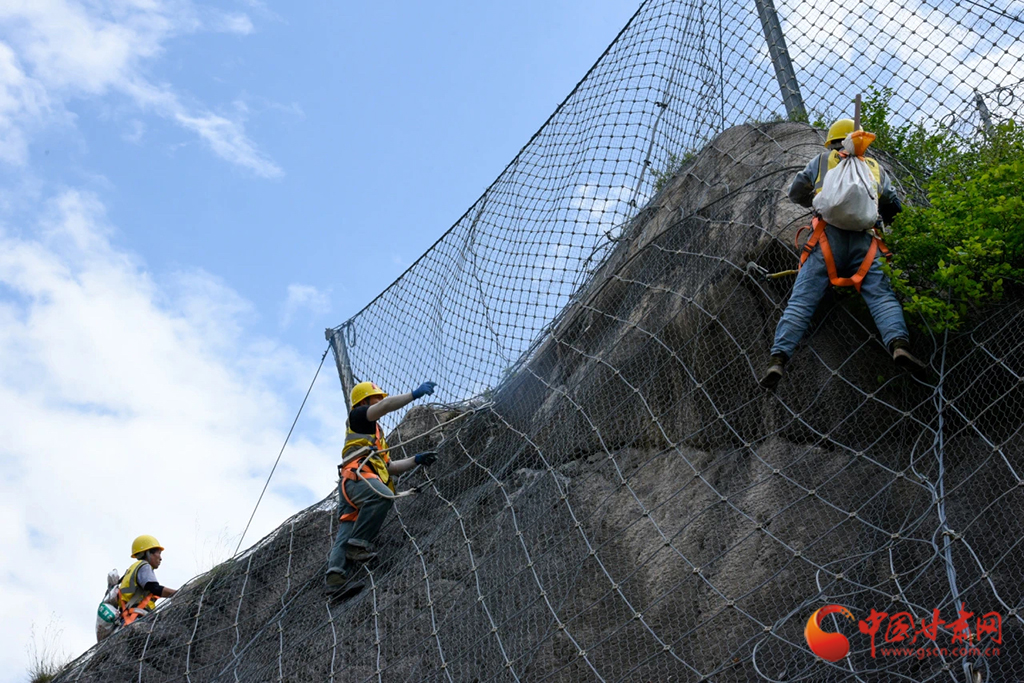 近日,隴海鐵路魏家磨1號隧道上方的山體上,蘭州鐵路局定西工務(wù)段新陽鎮(zhèn)橋路養(yǎng)修工區(qū)的作業(yè)人員,一手抓安全繩,一手拿檢查錘,攀附在懸崖峭壁上仔細(xì)排查防護(hù)網(wǎng)內(nèi)危石情況,及時(shí)消除落石隱患。
