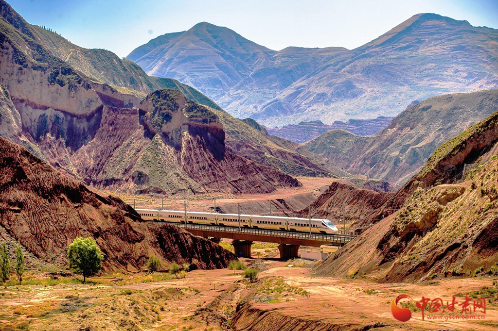 朝家山隧道位于蘭州市紅古區(qū)和青海省民和縣交界處,是蘭新高鐵西出蘭州必經(jīng)之地。在這里,通體呈紅色的丹霞地貌在湛藍天空下越發(fā)顯得艷麗奪目,列車穿越七彩丹霞,風景如畫風光無限好。