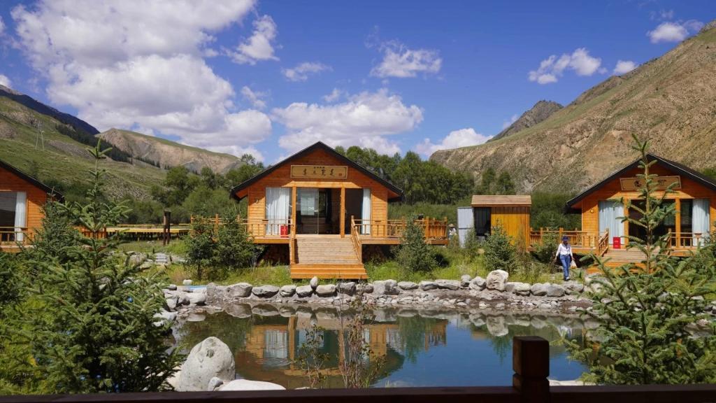 2023年7月起,安玉軍和幾戶村民改造自家院子,騰出開設(shè)農(nóng)家樂、牧家樂的房子,并打造燒烤和露營基地。步入基地,幾池清水將基地分成不同區(qū)域,木屋、牙帳、露臺散布其間,人們環(huán)繞池間小路行走,周邊連綿的祁連山上松木成林,牛羊悠閑。