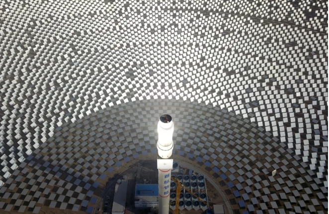 人們驚呼,這是自然力與人類智慧的完美創(chuàng)造:戈壁荒灘上“種”出了人造太陽。這個100兆瓦熔鹽塔式光熱電站,占地面積相當于780個足球場,每年所生產(chǎn)的綠電可減排35萬噸二氧化碳。