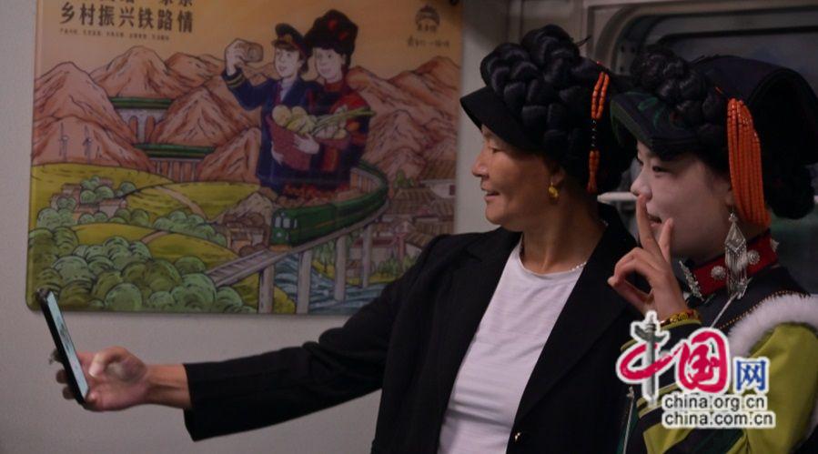 沿途,每當(dāng)列車停靠在車站等待的時(shí)間,彝族老鄉(xiāng)在鐵路工作人員的協(xié)同配合下搬起水果,牽起牛羊,抱起雞鴨放進(jìn)一節(jié)節(jié)行李車廂上,慢火車的貨架上擺滿了農(nóng)產(chǎn)品。車廂里,人們互相交談,圍坐在一起放聲歌唱,好不熱鬧,歡樂的聲音從車廂內(nèi)傳出,像是在向廣袤的山川大地宣告著彝歷新年的盛事。