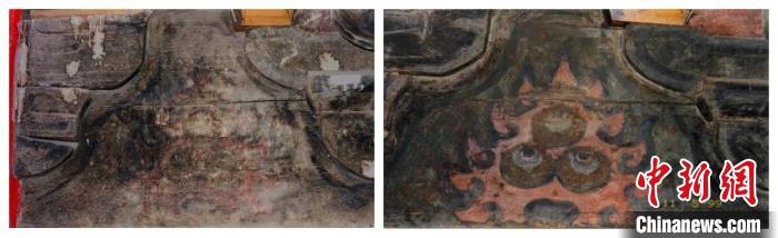 圖為1999年拍攝的長樂門內(nèi)檐彩畫顏料層顯色加固前后對(duì)比。(陜西師范大學(xué)歷史文化遺產(chǎn)保護(hù)教育部工程研究中心供圖)