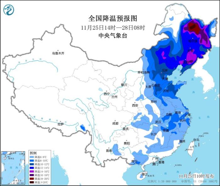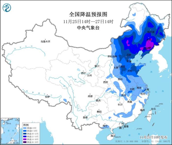 預(yù)計,11月25日14時至11月27日14時,內(nèi)蒙古中東部、華北、東北地區(qū)中南部、黃淮、江淮、江漢東部、江南北部等地將先后降溫6~10℃,其中,內(nèi)蒙古中部、華北北部、東北地區(qū)中南部等地部分地區(qū)降溫可達12℃以上。