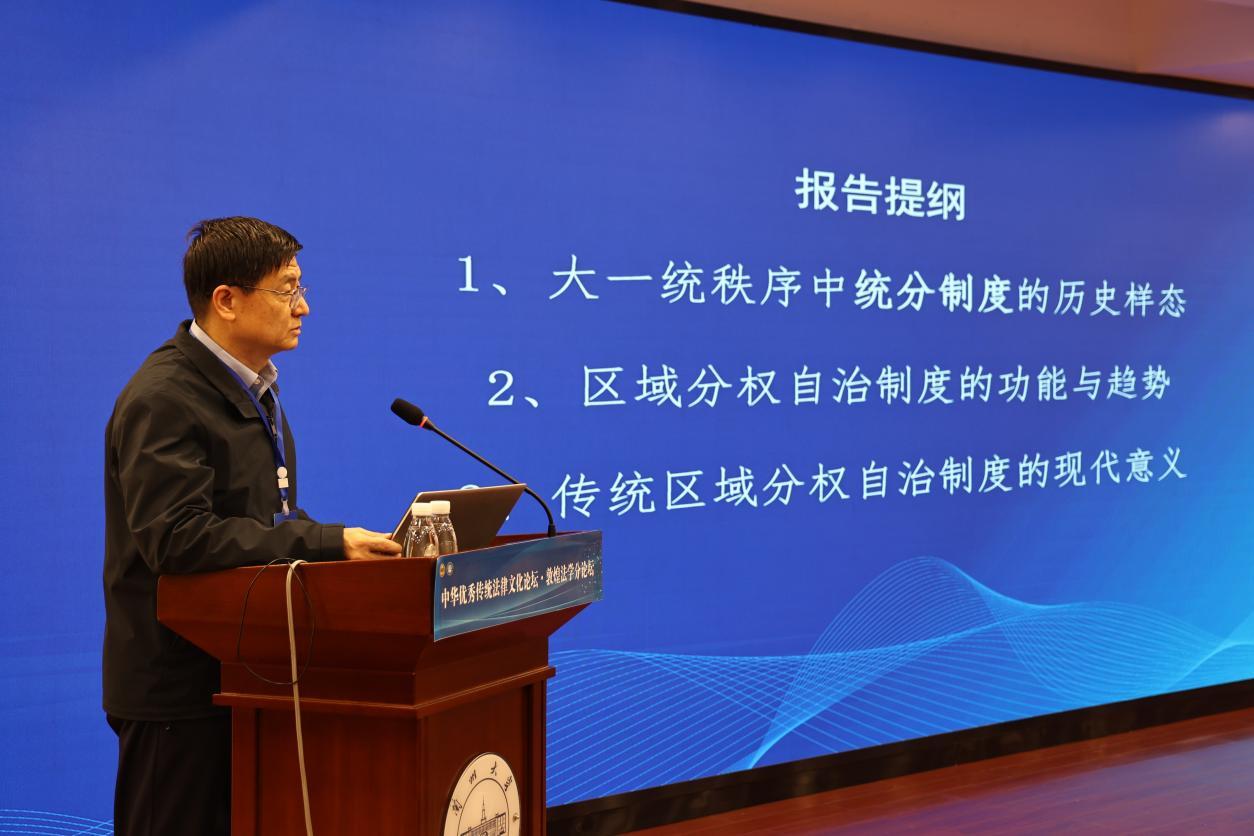 中國社會(huì)科學(xué)院法學(xué)研究所二級(jí)研究員、博士生導(dǎo)師、法制史研究室主任、中國法律史學(xué)會(huì)會(huì)長(zhǎng)、第七屆“全國十大杰出青年法學(xué)家”張生,從大一統(tǒng)秩序中統(tǒng)分制度的歷史樣態(tài)、區(qū)域分權(quán)自治制度的功能與趨勢(shì)、傳統(tǒng)區(qū)域分權(quán)自治制度的現(xiàn)代意義等方面作了題為“大一統(tǒng)秩序下的統(tǒng)分制度及其現(xiàn)代意義”的主旨報(bào)告。