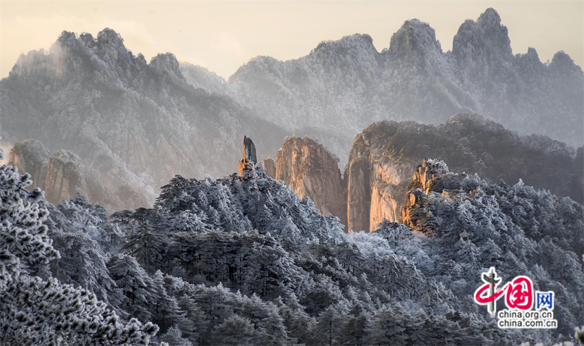 11月25日夜,安徽黃山風(fēng)景區(qū)迎來入冬首場(chǎng)降雪。26日,雪后初霽,五百里黃山銀裝素裹、分外妖嬈。山峰、奇松、怪石在朝陽的關(guān)愛下披上了一層金色的外衣。松林相間雪花層疊,熠熠生輝,翠色與銀白交織,宛如瓊枝玉樹,讓人流連忘返。