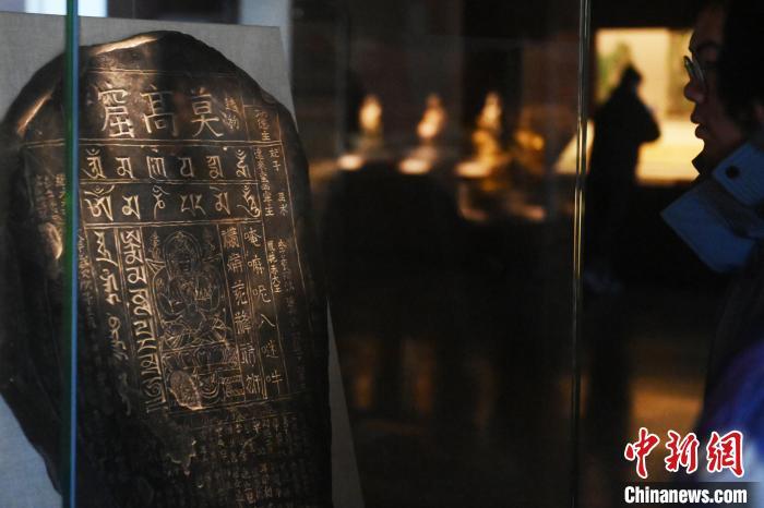 11月28日,甘肅省敦煌市,敦煌研究院敦煌石窟文物保護(hù)研究陳列中心,游人參觀《披沙揀金——敦煌研究院館藏文物擷英展》中的碑刻。該展由敦煌研究院主辦,2024年下半年煥新布展,展出了不同類型館藏文物,通過(guò)這些文物蘊(yùn)含的豐富歷史信息,展現(xiàn)了敦煌文化的多元與包容,勾勒不同文明偕行共進(jìn)的歷史脈絡(luò)。中新社記者 李亞龍 攝