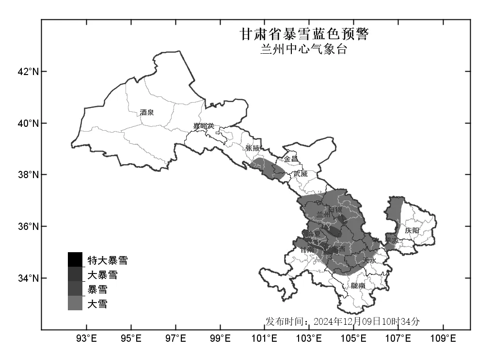 中國(guó)甘肅網(wǎng)12月9日訊(西北角·中國(guó)甘肅網(wǎng)記者 沈文剛)12月9日10時(shí)34分,蘭州中心氣象臺(tái)發(fā)布暴雪藍(lán)色預(yù)警,預(yù)計(jì)9日15時(shí)至10日20時(shí),蘭州、白銀、定西、臨夏等市州及甘南北部、天水西部、平?jīng)鑫鞑俊c陽(yáng)西部、張掖南部、武威南部將出現(xiàn)大雪;臨夏南部、定西西部、蘭州南部、白銀中部將出現(xiàn)暴雪。