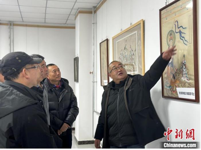 12月17日,由蘭州市七里河區(qū)委宣傳部、七里河區(qū)文體旅局聯(lián)合舉辦的“大漠孤陽(yáng)映彩霞 敦煌神韻美如畫(huà)”新時(shí)代文明實(shí)踐主題活動(dòng)暨敦煌巖彩畫(huà)書(shū)畫(huà)藝術(shù)展拉開(kāi)帷幕。圖為展覽組織者為參觀者講解展出的作品。楊娜 攝