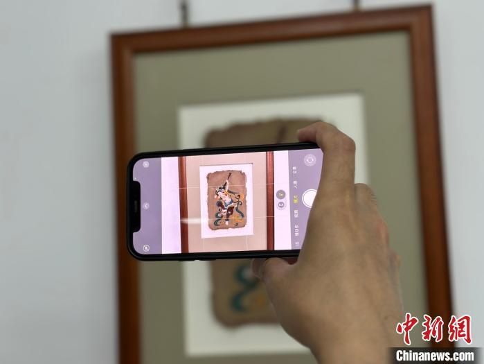 12月17日,由蘭州市七里河區(qū)委宣傳部、七里河區(qū)文體旅局聯(lián)合舉辦的“大漠孤陽(yáng)映彩霞 敦煌神韻美如畫(huà)”新時(shí)代文明實(shí)踐主題活動(dòng)暨敦煌巖彩畫(huà)書(shū)畫(huà)藝術(shù)展拉開(kāi)帷幕。圖為參觀者拍攝展出的“反彈琵琶”題材巖彩畫(huà)。楊娜 攝