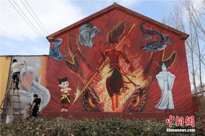 2025年2月12日,山東淄博周村區(qū)沈家村,一幅高10米、寬8米的哪吒墻繪走紅。該墻繪由當?shù)?ldquo;90后”墻繪師沈靖宇手繪完成。中新社記者 王采怡 攝
