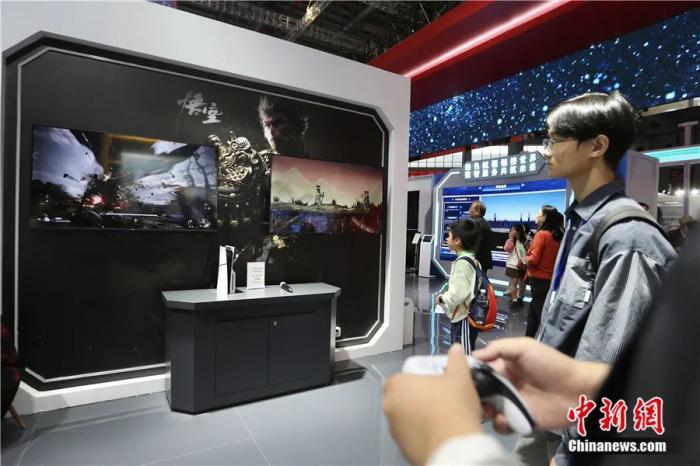 2024年11月5日至10日,第七屆中國國際進口博覽會在上海舉辦。圖為11月9日觀眾在中國館體驗游戲《黑神話:悟空》。中新社記者 王紫儒 攝