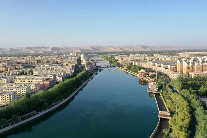 乘飛機(jī)從甘肅省會(huì)蘭州往西飛行約兩個(gè)小時(shí)后,茫茫戈壁上一個(gè)綠色小點(diǎn)出現(xiàn)在視線里。隨著飛機(jī)高度下降,俯瞰下去,一片多邊形的綠洲逐漸顯現(xiàn),如一塊美麗寶石。