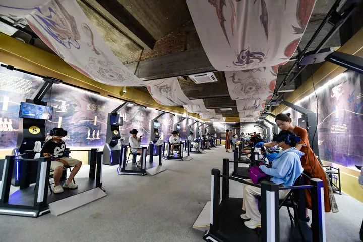 2024年7月22日,游客在敦煌體驗(yàn)“尋境敦煌——數(shù)字敦煌沉浸展”。新華社記者 郎兵兵 攝