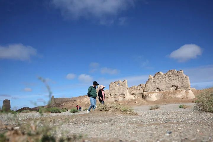 2024年9月4日,游客在雨后的玉門關(guān)遺址區(qū)大方盤城游覽。新華社記者 陳斌 攝