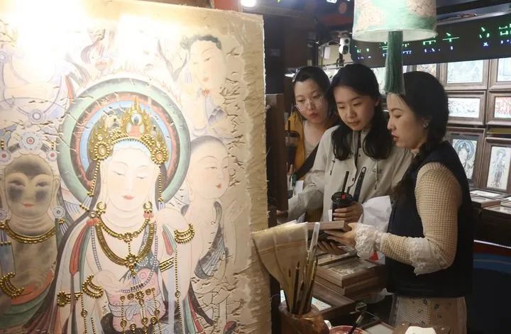 街道上,獨(dú)具特色的文化元素?zé)o處不在。民宿老板用改良的“三兔共耳”紋樣裝飾門楣,茶館的八棱柱竟是莫高窟中心塔柱的微縮版。最多的還是書店和文創(chuàng)店,一家挨著一家,紅柳根雕、敦煌樂器、創(chuàng)意工美、飛天泥版畫琳瑯滿目。