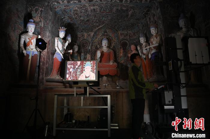2024年6月5日,甘肅省敦煌市莫高窟內(nèi),敦煌研究院文物數(shù)字化研究所工作人員進(jìn)行敦煌壁畫(huà)數(shù)字化采集工作?!≈行律缬浾?nbsp;李亞龍 攝