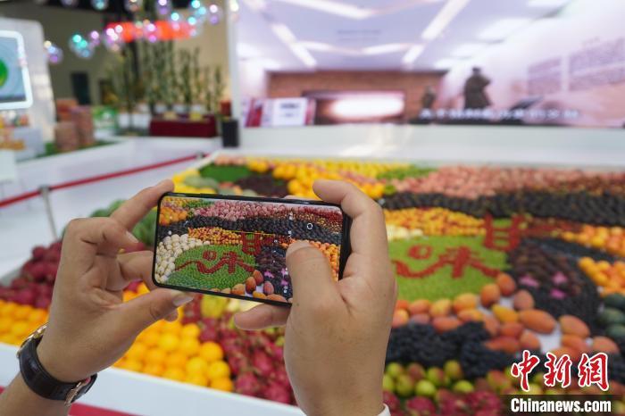 2022年7月10日,第二十八屆中國蘭州投資貿(mào)易洽談會展區(qū)展示甘肅地方特色產(chǎn)品。圖為參觀者手機拍攝用農(nóng)產(chǎn)品拼裝的“甘味”。(資料圖)九美旦增 攝