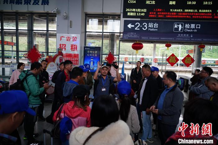 3月16日,云南省紅河州河口縣河口北站,一位導(dǎo)游組織越南旅游團(tuán)候車(chē)。中新社記者  劉冉陽(yáng)  攝