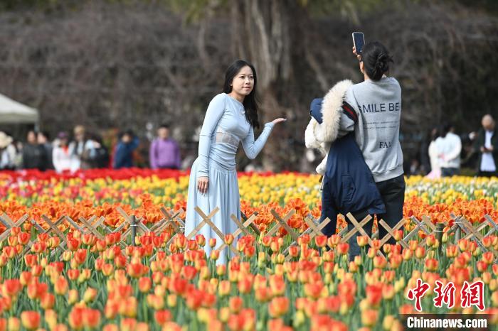 3月16日,位于湖南長沙的湖南省植物園數(shù)十萬株郁金香肆意綻放,五彩斑斕的花瓣交織成一片絢麗花海,引得眾多游人紛至沓來,享受愜意春日。圖為游人置身花叢中。中新社記者 楊華峰 攝
