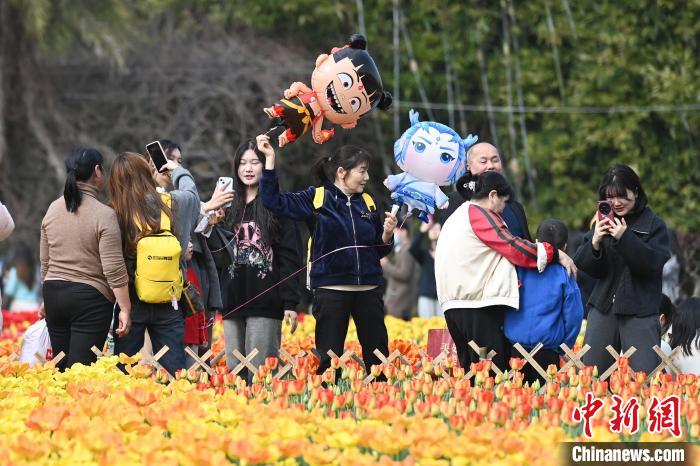圖為游人拿著哪吒與敖丙的氣球賞花。中新社記者 楊華峰 攝