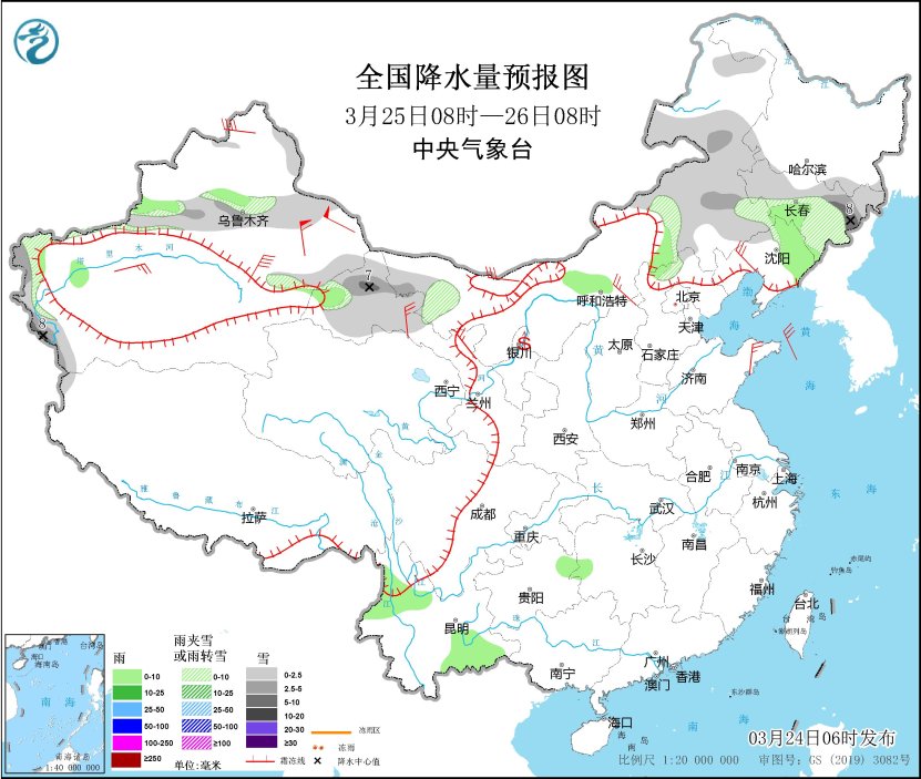 3月24日08時(shí)至25日08時(shí),新疆北部和沿天山地區(qū)、內(nèi)蒙古東部、黑龍江西北部、吉林西北部和東部、河北北部等地部分地區(qū)有小到中雪或雨夾雪,其中,新疆阿勒泰和沿天山高海拔地區(qū)、內(nèi)蒙古東部等地部分地區(qū)有大到暴雪(10~15毫米)。新疆沿天山地區(qū)和伊犁河谷、內(nèi)蒙古東南部和西北部、遼寧北部、華北北部、西南地區(qū)南部和東部等地部分地區(qū)有小雨,其中,新疆伊犁河谷等地部分地區(qū)有中到大雨。內(nèi)蒙古中西部、山西北部、河北北部、黑龍江西部、山東半島、新疆北部等地部分地區(qū)有4~6級(jí)風(fēng)。內(nèi)蒙古西部、寧夏北部等地部分地區(qū)有揚(yáng)沙或浮塵,局地有沙塵暴。