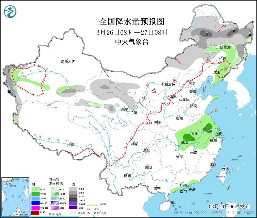 3月26日08時(shí)至27日08時(shí),內(nèi)蒙古東部、黑龍江大部、吉林東部、新疆南疆西部山區(qū)、甘肅河西、青海北部等地部分地區(qū)有小到中雪或雨夾雪,其中,內(nèi)蒙古東北部、黑龍江中東部、新疆南疆西部山區(qū)等地部分地區(qū)有大雪(5~9毫米)。吉林中部、遼寧東部、江淮大部、江漢東部、江南北部、廣東南部沿海等地部分地區(qū)有小雨,其中,湖北東部、安徽中部、江蘇西南部等地部分地區(qū)有中雨。內(nèi)蒙古大部、西北地區(qū)中東部、華北大部、東北地區(qū)西部、新疆南疆盆地等地部分地區(qū)有4~6級(jí)風(fēng)。內(nèi)蒙古中西部、寧夏等地部分地區(qū)有揚(yáng)沙。
