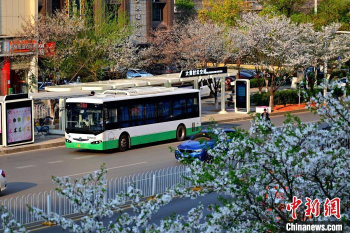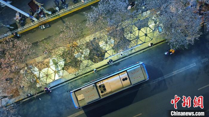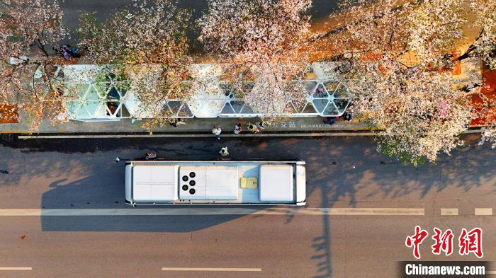 3月26日,被譽(yù)為武漢“最美櫻花車站”的珞喻東路大黃村公交站櫻花盛放。經(jīng)過改造的大黃村公交站,新增了自助售貨機(jī)、衛(wèi)生間、共享充電寶等便民設(shè)施,煥然一新的科技智慧站臺與粉白如霞的櫻花相映生輝。微風(fēng)吹過,櫻花花瓣浪漫飄零,吸引不少市民游客觀賞“打卡”。圖為公交車在珞喻東路大黃村公交站停留。(無人機(jī)照片)劉康 攝