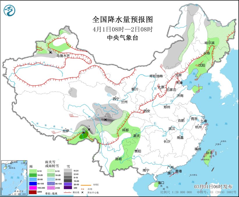 4月1日08時至2日08時,內(nèi)蒙古東部、黑龍江中東部、吉林東部、遼寧東北部、新疆西北部山區(qū)、西藏東部、青海南部、川西高原北部等地部分地區(qū)有小到中雪或雨夾雪,其中,新疆沿天山地區(qū)、西藏東部、川西高原北部等地部分地區(qū)有大雪,局地暴雪(10~16毫米)。新疆伊犁河谷和北疆盆地、西藏東南部、吉林中部、遼寧大部、山東半島、西南地區(qū)東部和南部、海南島東部、臺灣島等地部分地區(qū)有小到中雨,其中,西藏東南部等地局部地區(qū)有大雨(25~40毫米)。西藏南部、內(nèi)蒙古中部、遼寧中南部、河北中南部、天津、山西、山東半島、浙江東部等地部分地區(qū)有4~6級風,西藏東部部分地區(qū)有6~7級風;渤海、渤海海峽、黃海西部、東海南部、臺灣海峽、臺灣以東洋面、巴士海峽、南海中北部海域有6~7級風,陣風8級。