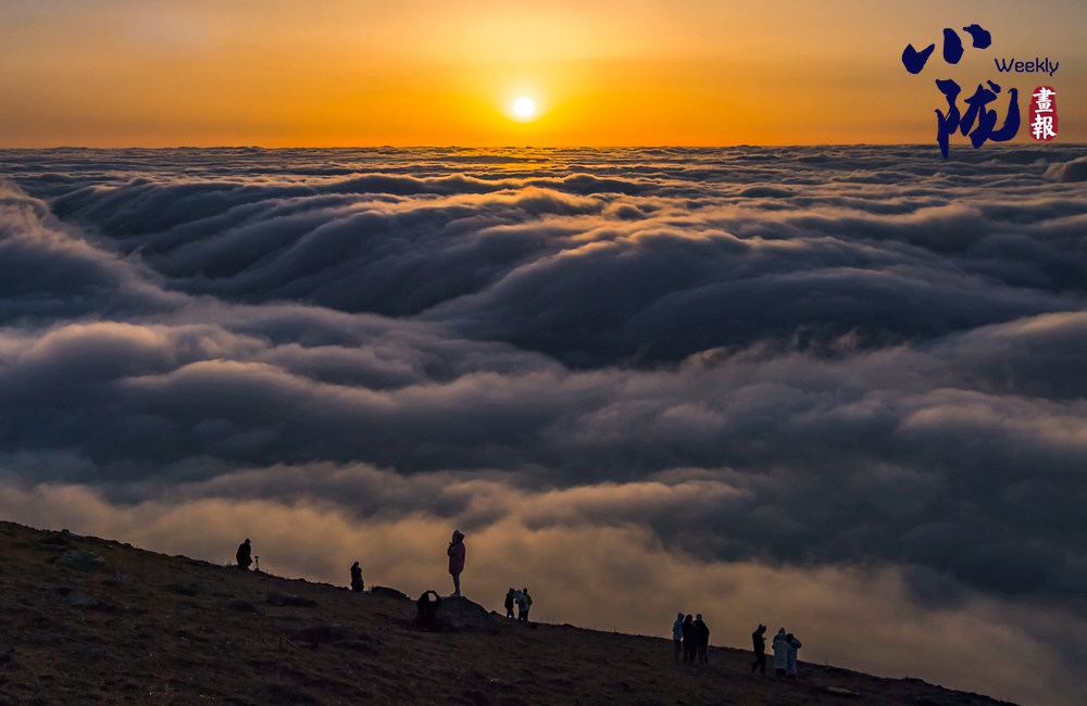 登頂望遠(yuǎn),千壩草原高山、草甸、草原相互交織,牛馬、羊群像一顆顆散落的珍珠點(diǎn)綴其中。茫茫云海鋪滿整個(gè)天際,翻涌的流云大河奔騰,蔚為壯觀,如臨于大海之濱。