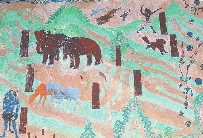 東漢應(yīng)劭在《風(fēng)俗通義·祀典》中寫道:“臘者,獵也,言田獵取獸以祭祀先祖也。或曰:‘臘者’接也,新故交接,故大祭以報(bào)功也。”意思是說一年中最后一個(gè)月是古人用來狩獵的月份,而狩獵所獲的獵物會(huì)被風(fēng)干做成臘肉來祭祀祖先。這個(gè)月也被叫作“獵月”或是“臘月”。據(jù)《禮記·月令》記載,在秋季的最后一個(gè)月舉行田獵,借此機(jī)會(huì)教民戰(zhàn)陣,練習(xí)五種兵器的使用,并頒布乘馬的政令。獵畢,命令主管祭祀的官員,用獵獲的鳥獸祭祀四方之神。在莫高窟第249窟壁畫中有一幅“行獵圖”:畫面上都是些體形巨大的動(dòng)物,有體態(tài)矯健的猛虎、疾馳駿逸的鹿群等。還有在奔馳的駿馬上拈弓搭箭窮追不舍的獵人、在飛奔的駿馬上淡定轉(zhuǎn)身從容射虎的獵人。整個(gè)畫面既緊張又靜謐美好,使人不由得對(duì)畫師精湛的技藝心悅誠(chéng)服。